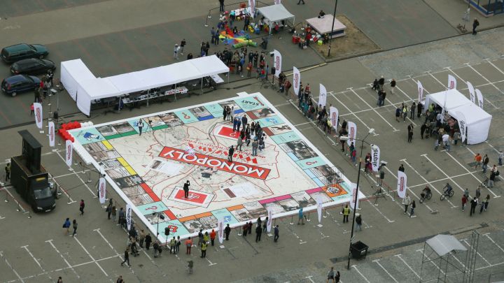 Do produkcji największej na świecie planszy „Monopoly” w Warszawie wykorzystano ponad trzydzieści kilogramów farby drukarskiej, pół roku przygotowań i wyprodukowano zeskalowane kostki, domki i hotele. Plansza w stolicy Polski wygląda zupełnie inaczej: skala jest imponująca.