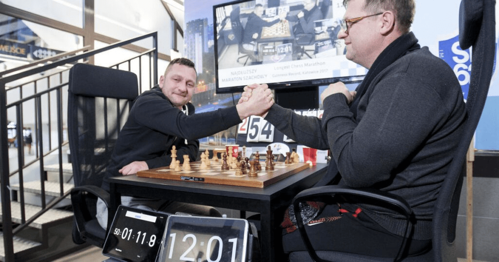 W Warszawie odbyła się również najdłuższa partia szachowa, która znalazła się w Księdze Rekordów Guinnessa. Rekord świata ustanowili w 2017 roku Jacek Gajewski i Wojciech Waruga. Partia szachowa Polaków trwała 50 godzin, minutę i siedem sekund. Pomimo intryg i długiej gry, do samego końca partii nie można było wyłonić zwycięzcy. Dwóm Polakom udało się jednak pobić rekord świata i dostać się do legendarnej Księgi Rekordów Guinnessa.